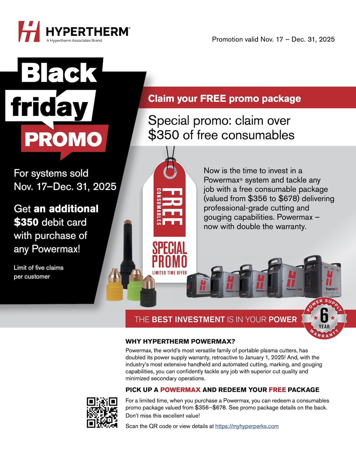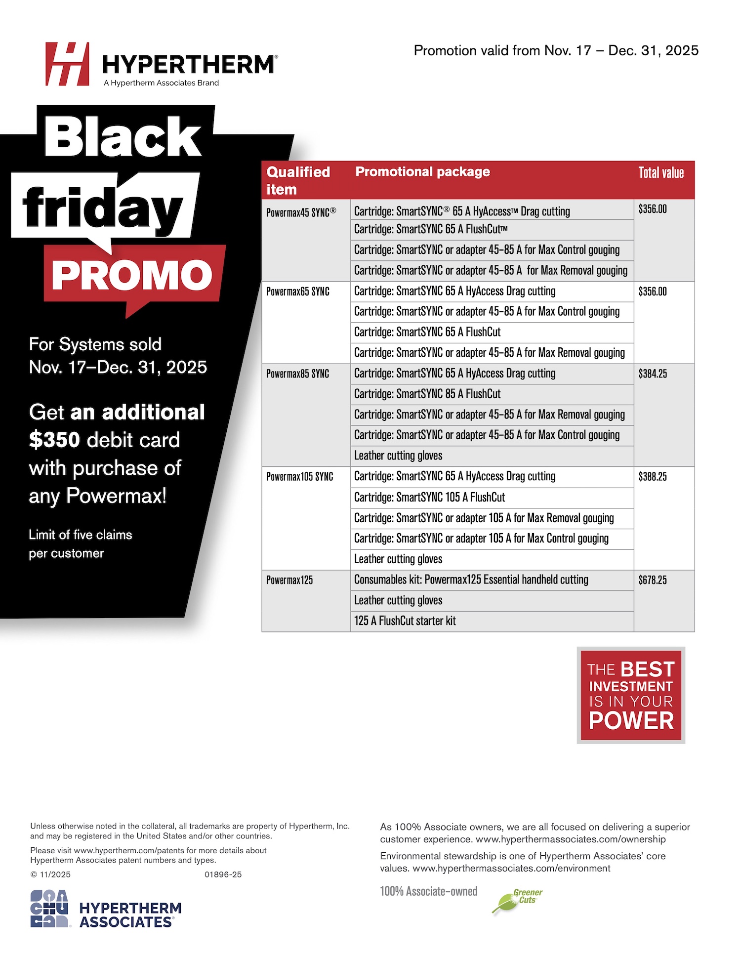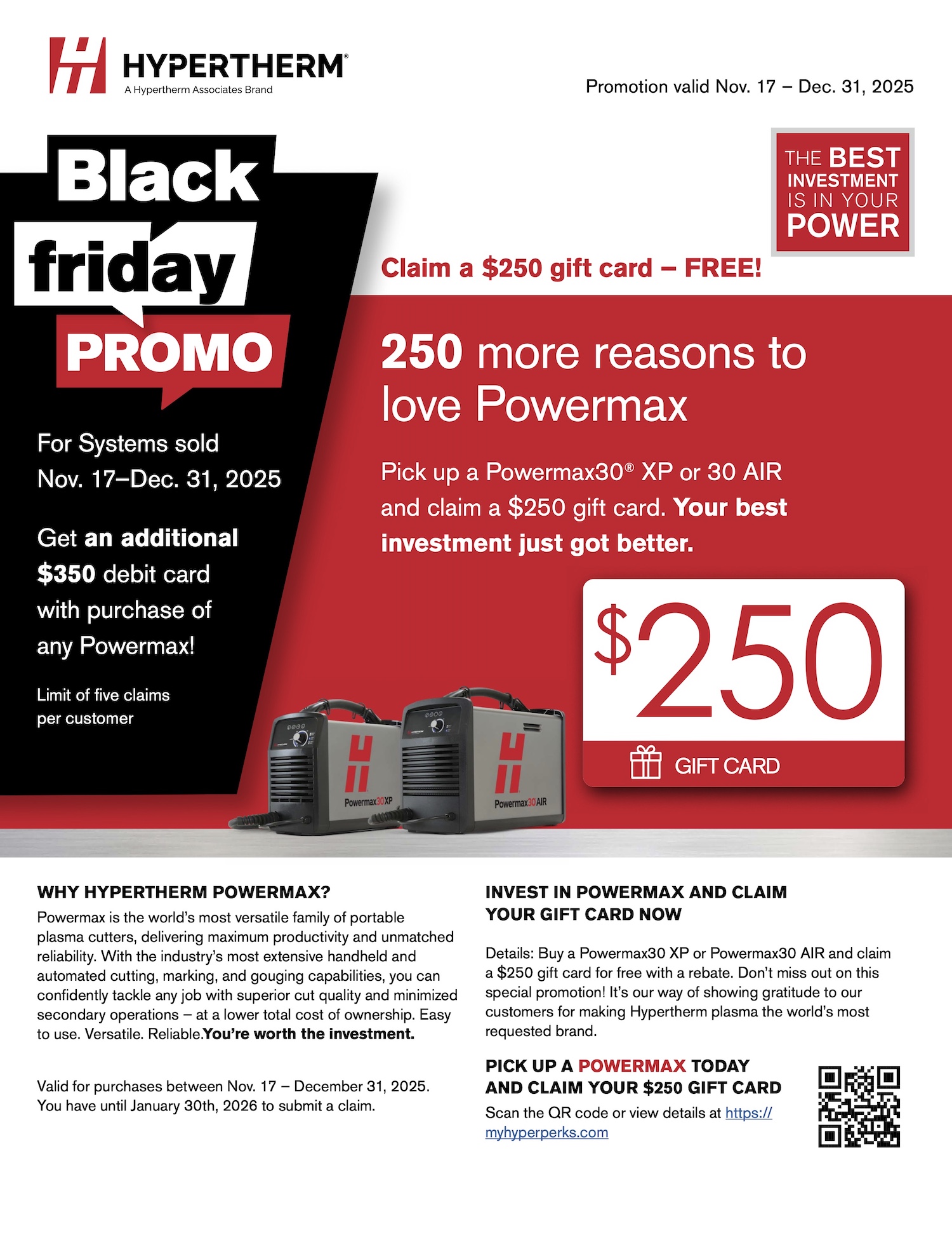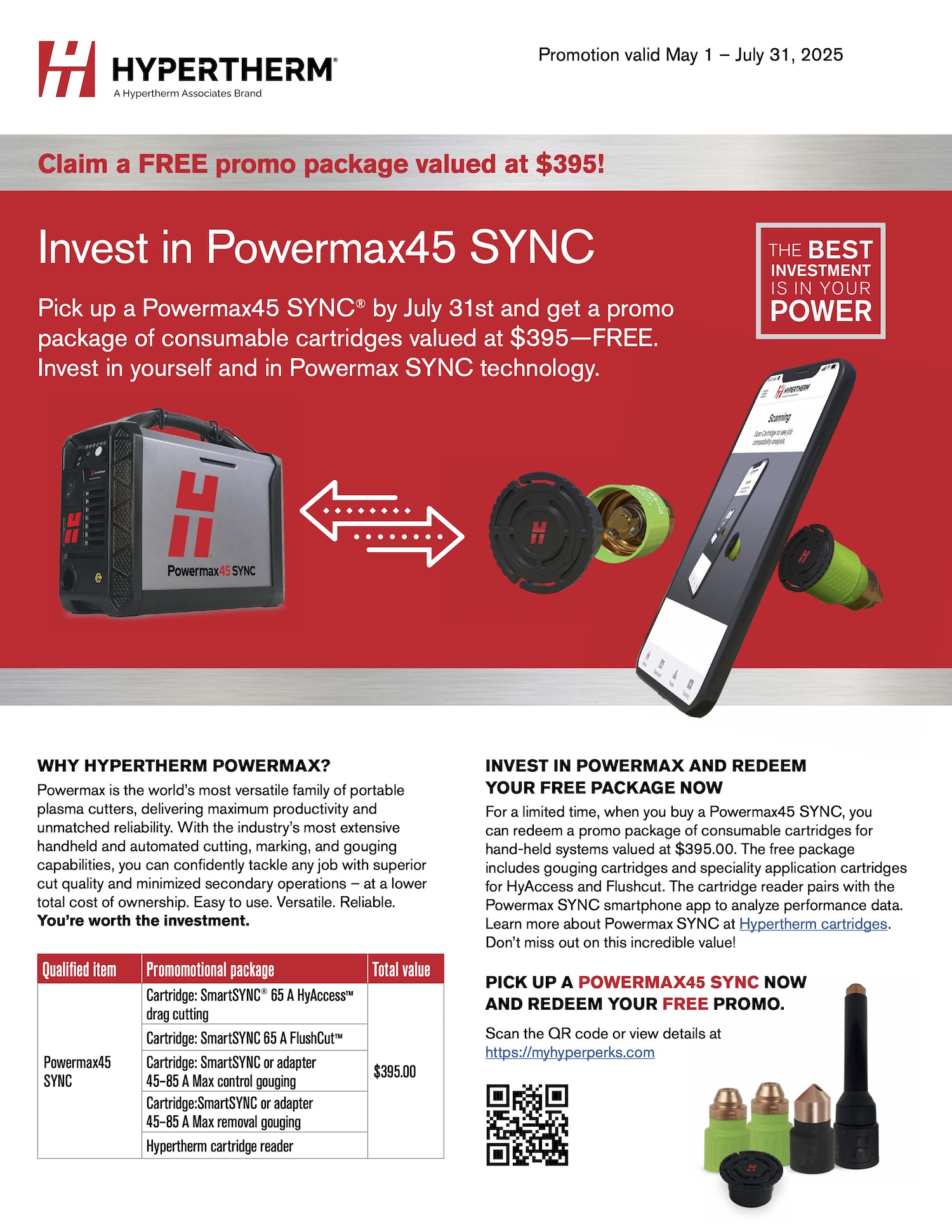 For a limited time you can get up to $428 in free consumables when you purchase a Powermax® from Hypertherm®!