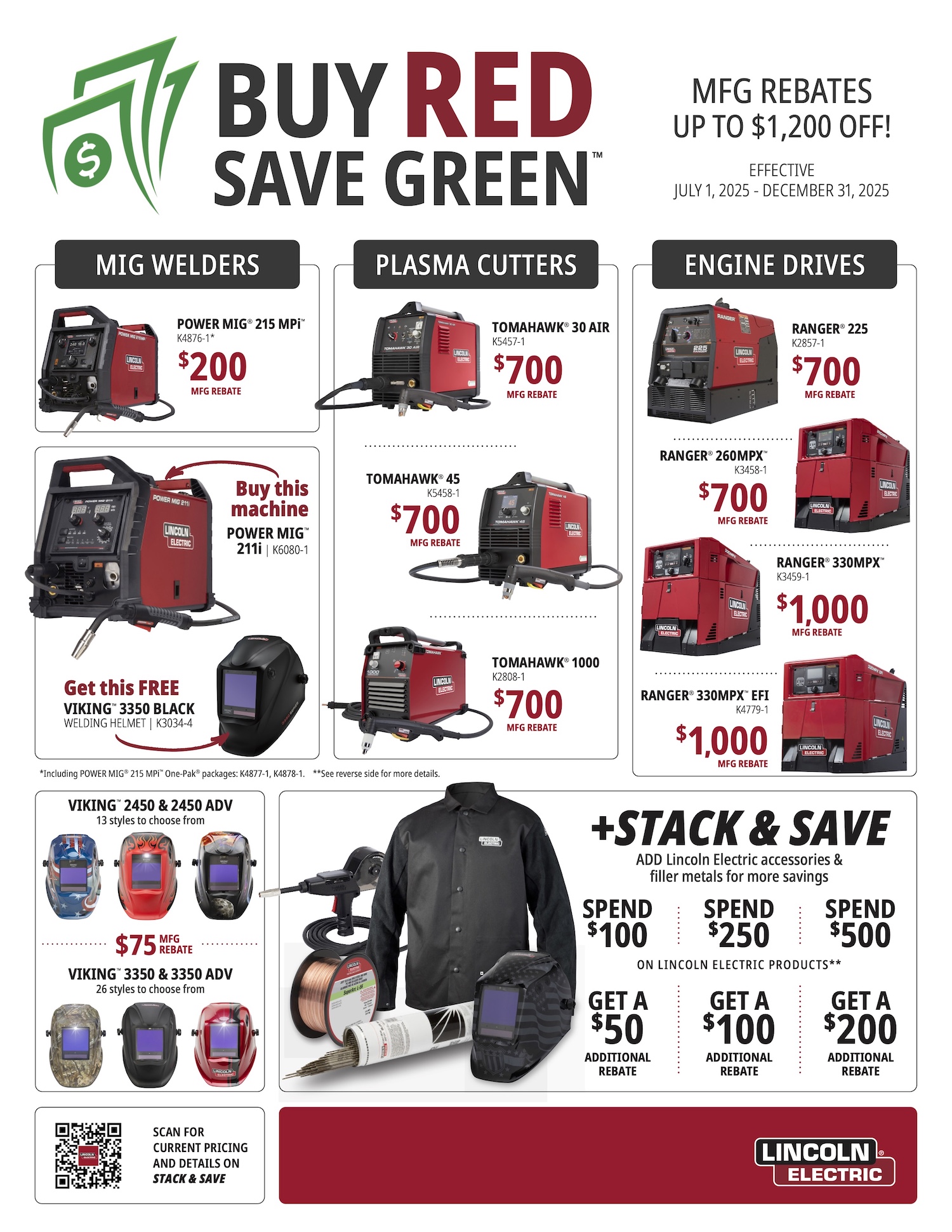 Get MFG rebates up to $1,200 on select Lincoln products and save up to $200 more by adding select Lincoln accessories and filler metals.