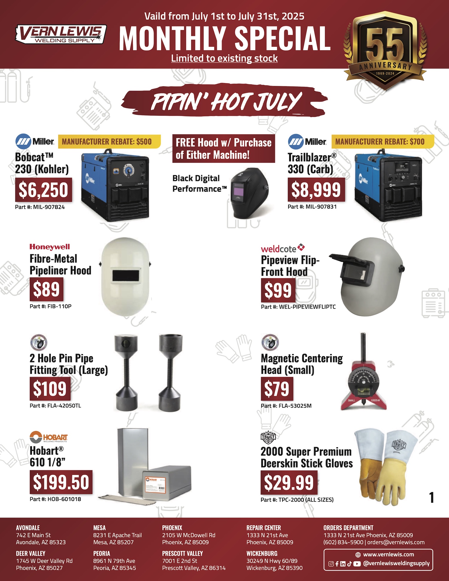 Check out these limited-time offers and rebates from Vern Lewis Welding Supply exclusively and from our biggest manufacturers. Available for purchase at any of our 8 locations including our repair center.